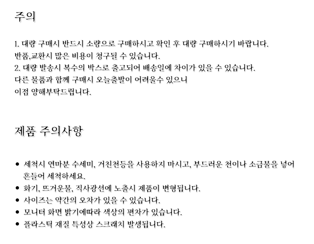 - 배송안내: 전국 배송이 가능하며, 토요일과 공휴일을 제외하고 평균 2~4일 소요됩니다.