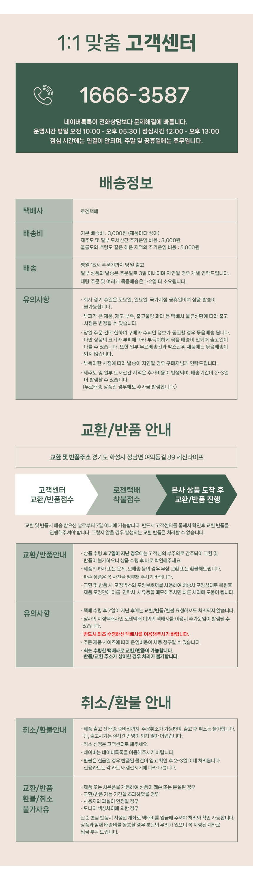 배송안내: 전국 배송이 가능하며, 토요일과 공휴일을 제외하고 평균 2~4일 소요됩니다.