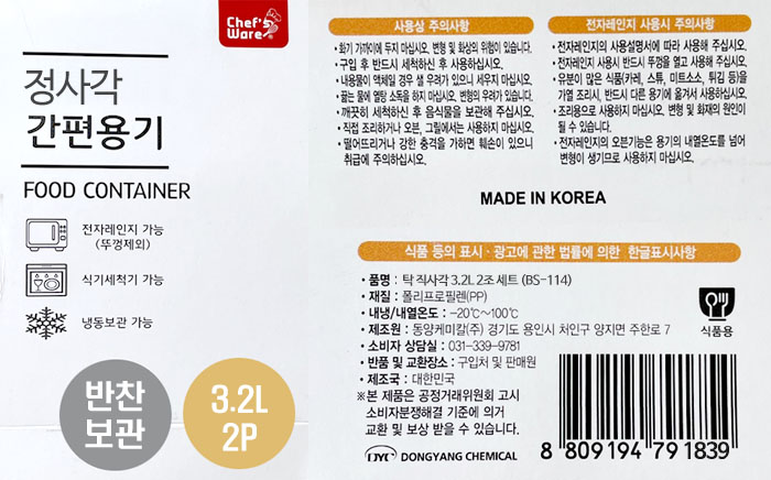동양 탁 투명 밀폐용기 3.2L 2P 정사각 다목적 보관용기